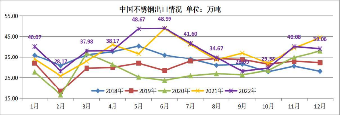 2022年1-12月,国内不锈钢出口累计量约455.13万吨,同比增加9.06万吨,增幅2.03%。