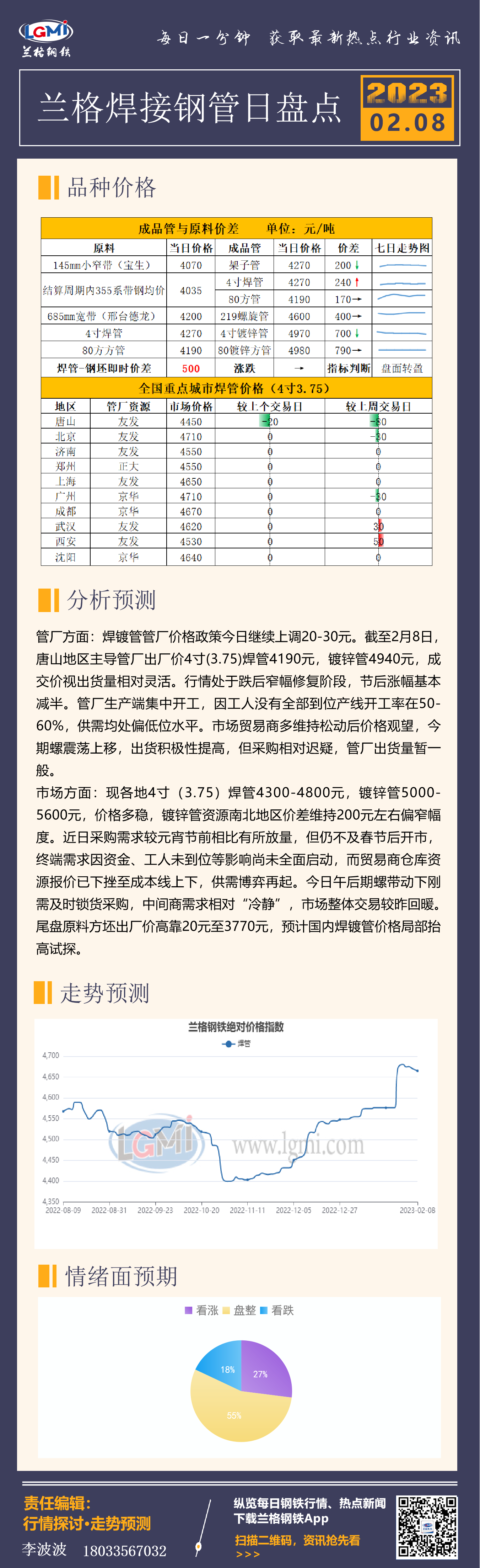 - 兰格焊管日盘点:期螺带动局部成交回暖 价格回涨试探2023/2/8
