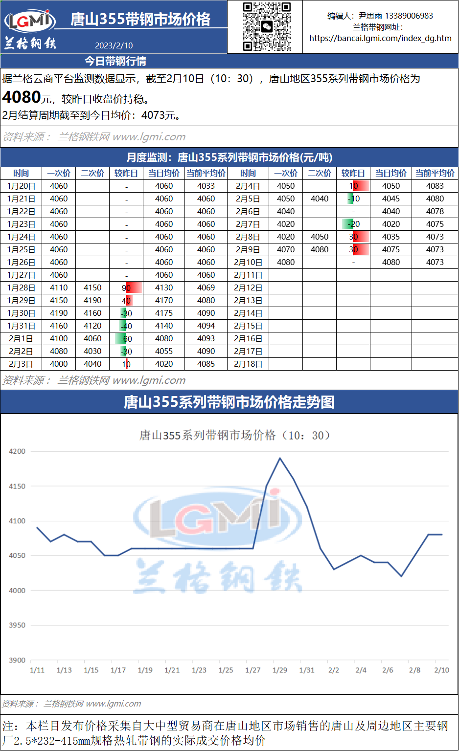 - 2月10日唐山带钢经安145-162系出厂价格涨10元2023/2/10