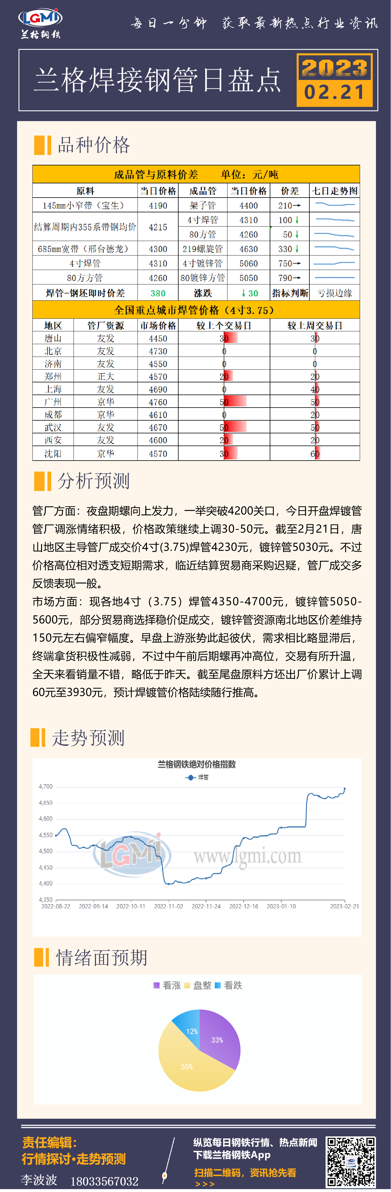 - 兰格焊管日盘点:期现高位向上 成交边观望边走热2023/2/21