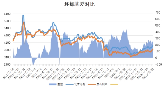 坯螺价差:以北京市场为例,2月23日河钢螺纹基价4200元与钢坯3950元,基差为250元,较上个交易日减小10元。
