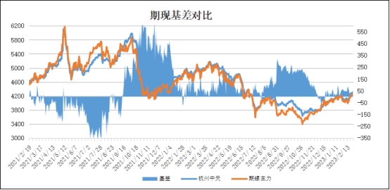 期现基差:以杭州市场为例,2月23日中天螺纹基价4280元与主力期螺收盘4228元,基差为52元,较上个交易日扩大9元。