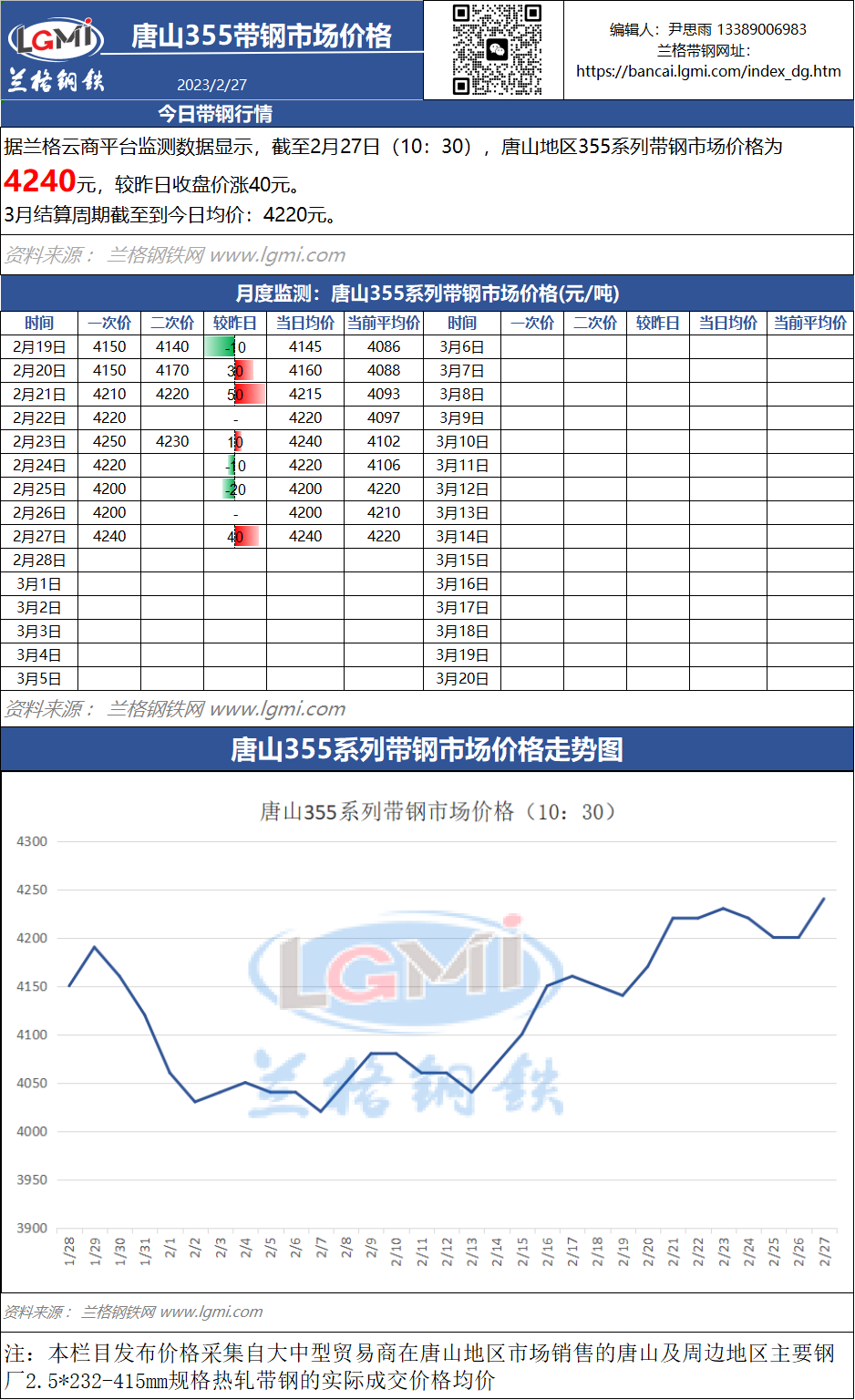 - 调价:2月27日唐山带钢宝生136-242系出厂价格再涨10元2023/2/27