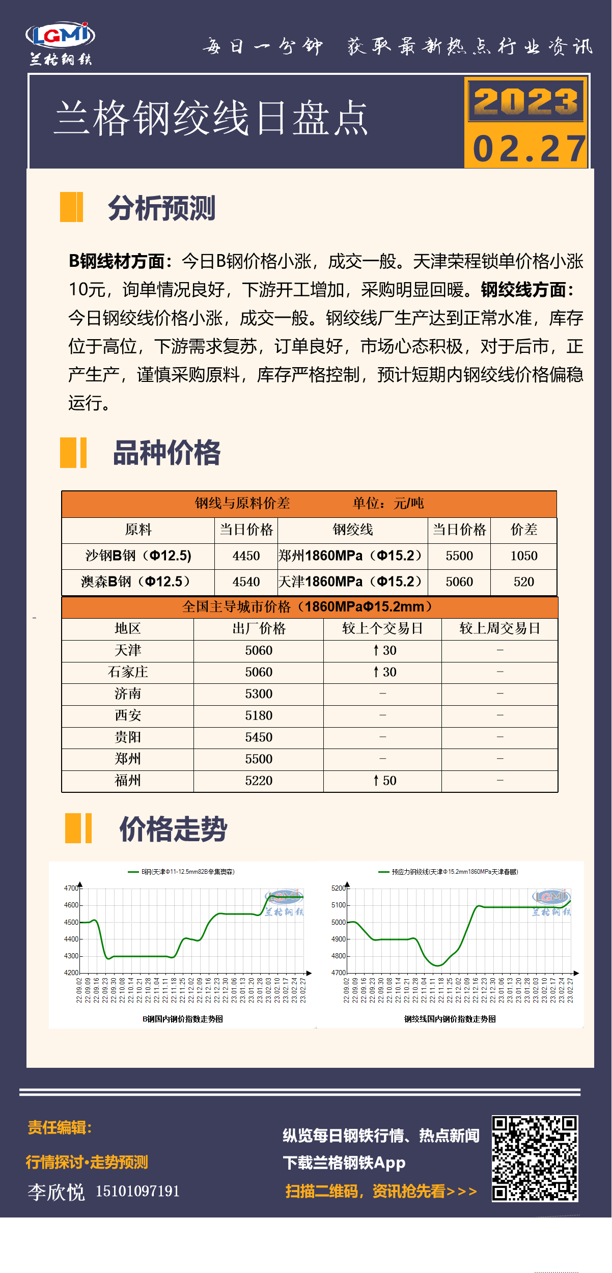 - 2月27日天津荣程B钢线材接单价格上调10元2023/2/27