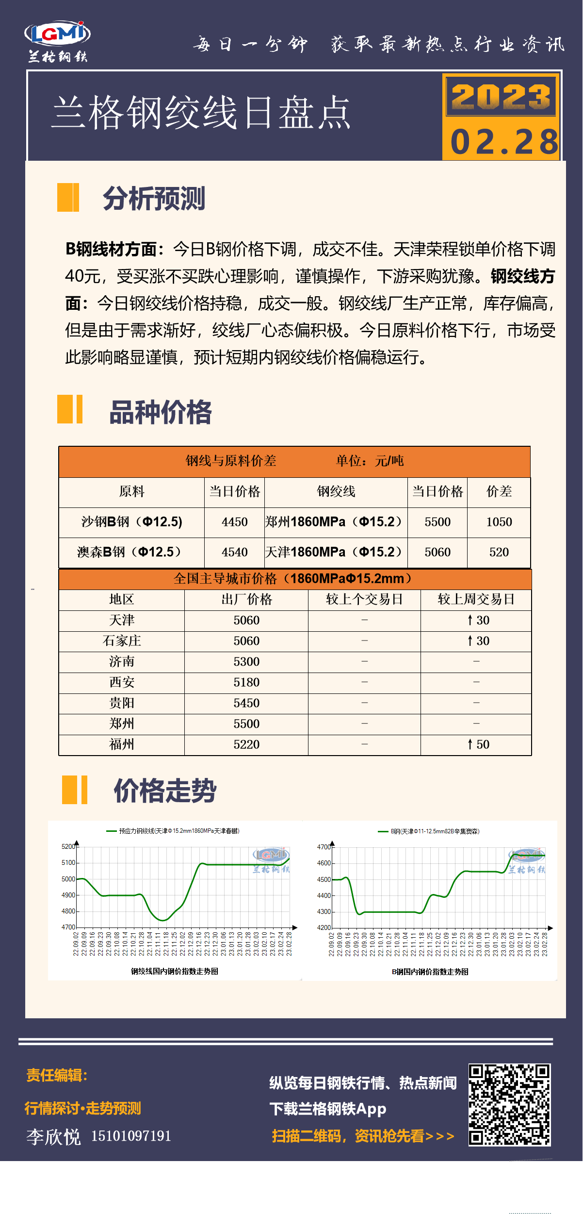 - 2月28日天津荣程B钢线材接单价格下调40元2023/2/28