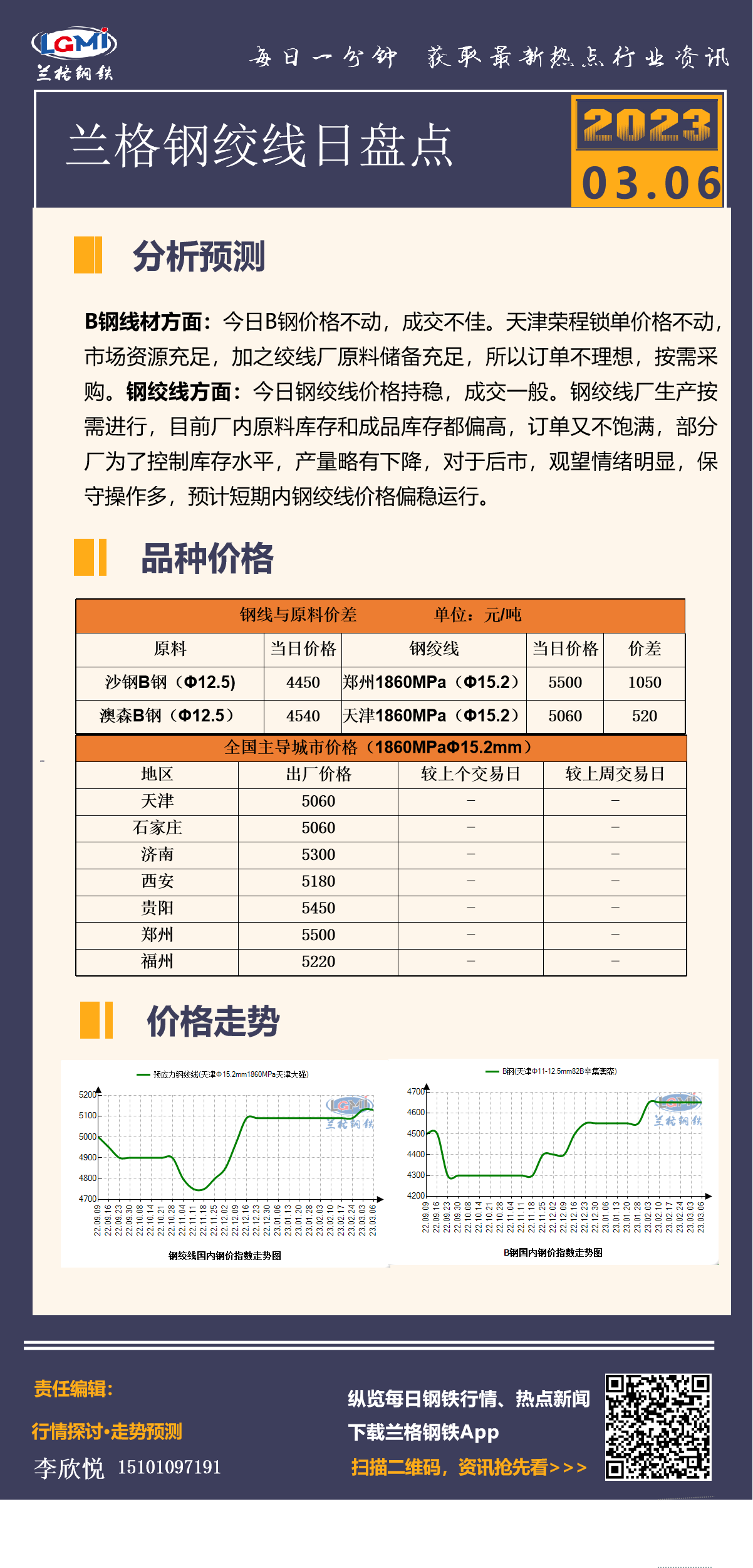 - 3月6日天津荣程B钢线材接单价格稳2023/3/6