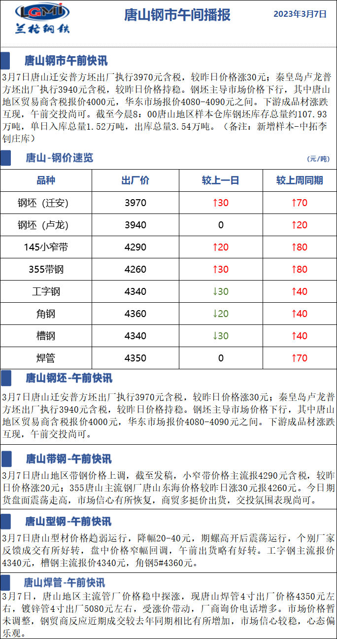 - 3月7日唐山津西钢铁带钢出厂价格涨10元2023/3/7