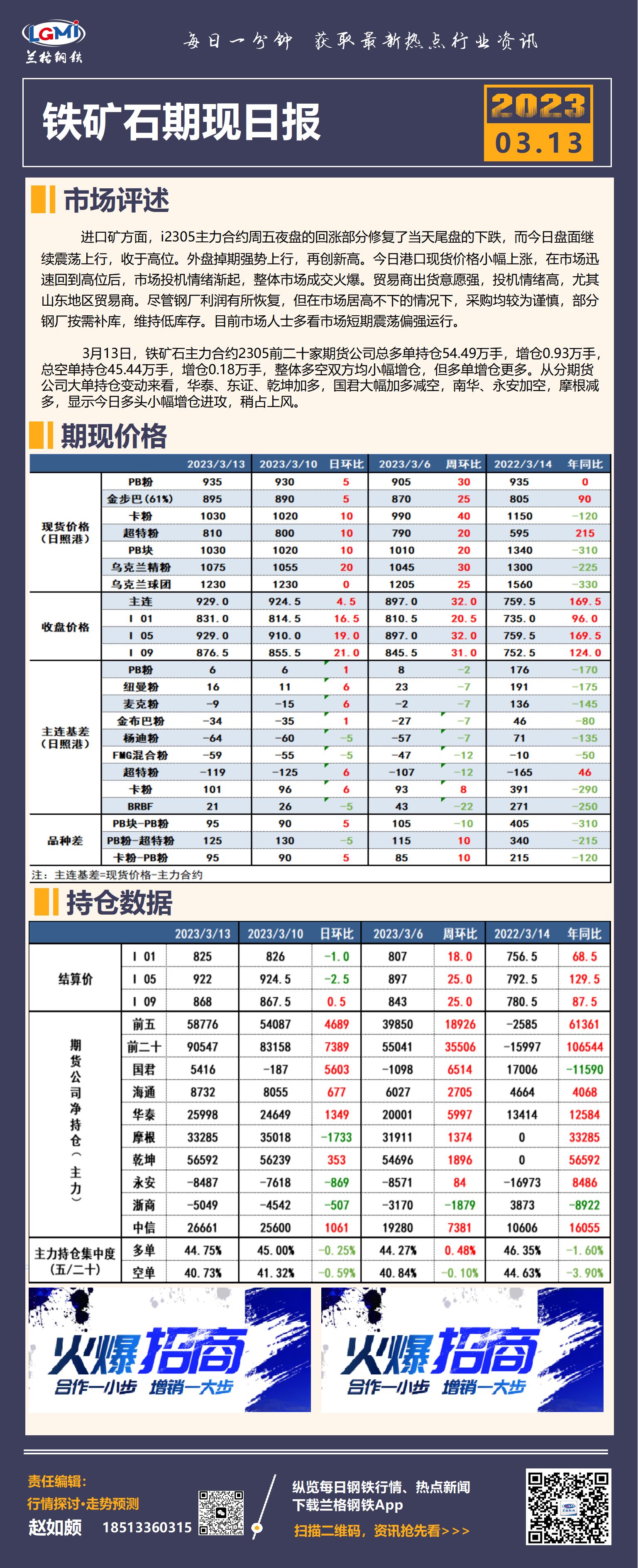 - 13日铁矿石期货收于929涨0.49%2023/3/13