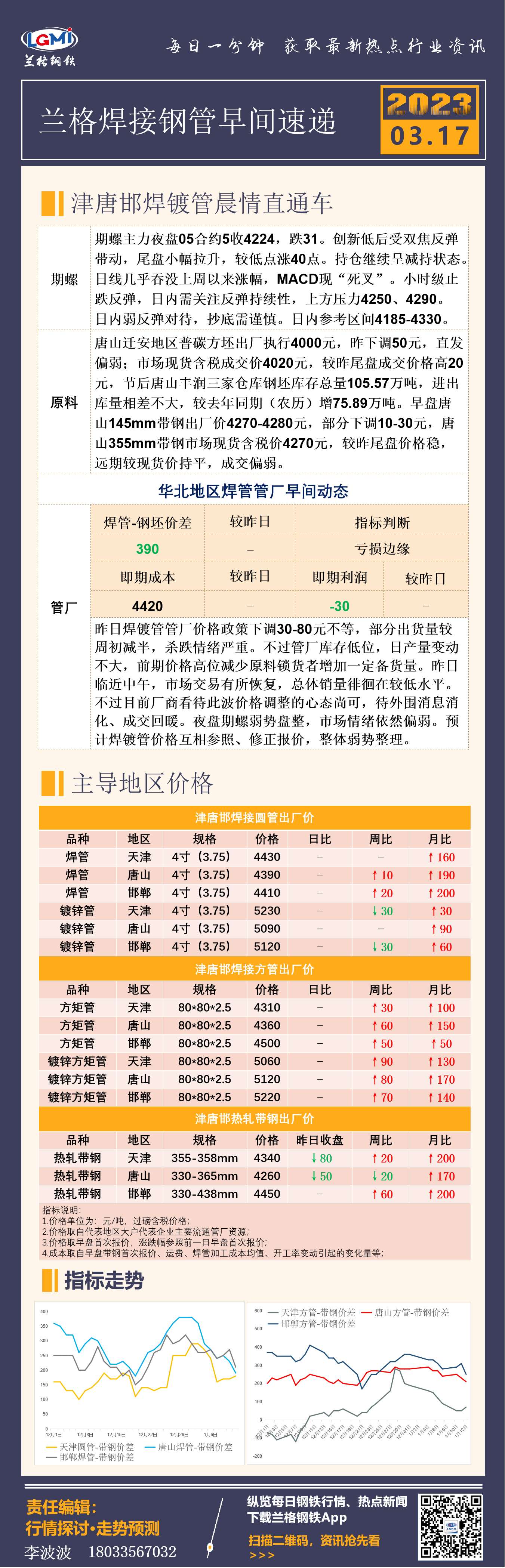 3月17日(9:20)兰格津唐邯焊接钢管早间速递