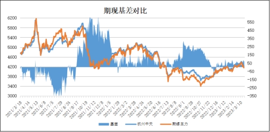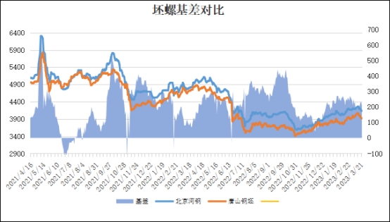 期现基差:以杭州市场为例,3月22日中天螺纹基价4220元与主力期螺收盘4153元,基差为67元,较上个交易日减小7元。