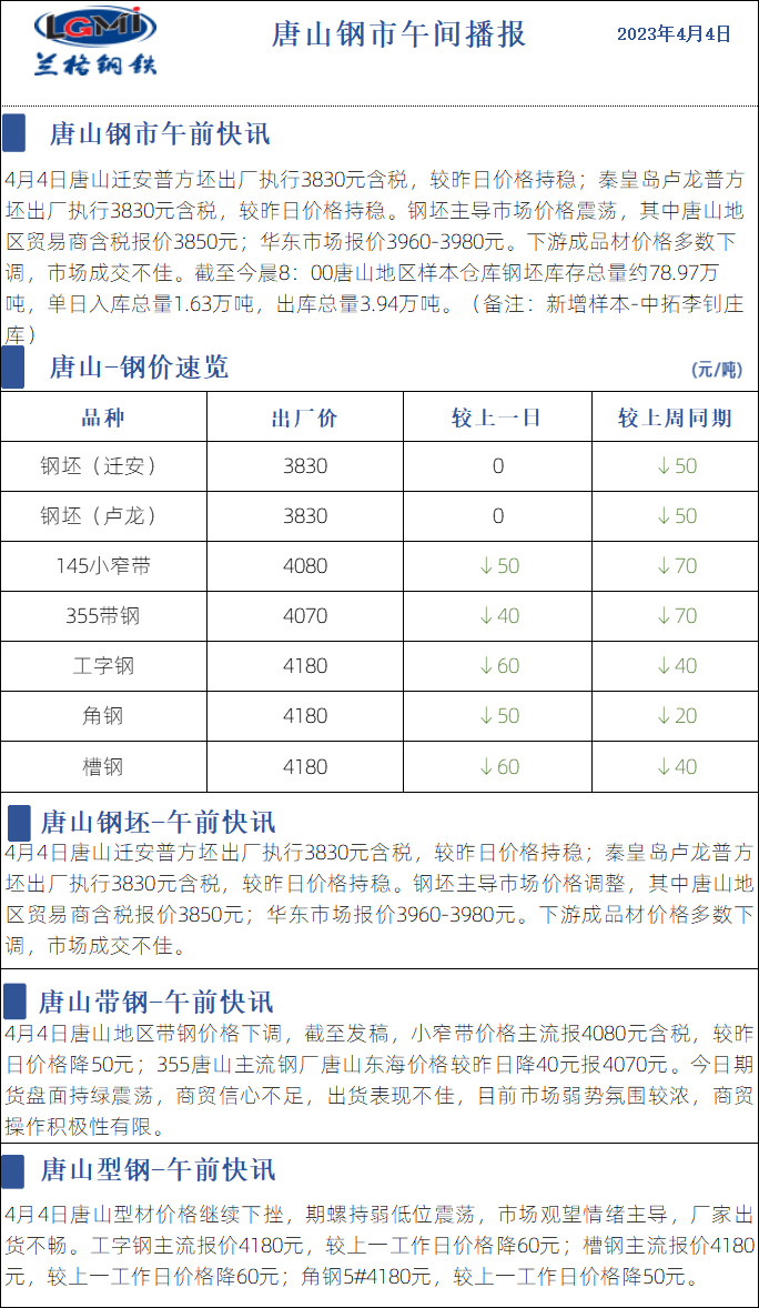 4月4日兰格唐山钢市午间播报
