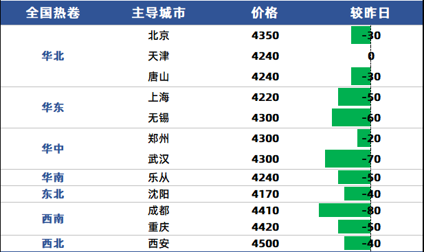 4月4日,现热轧5.5mm国内主导城市价格:天津4240元、上海4220元、乐从4240元、武汉4300元、成都4410元。