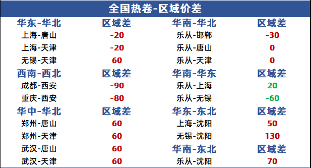 区域价格有所增加,上海-唐山价格为-20,乐从-邯郸价格为-30元。
