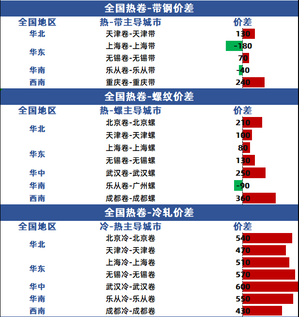 品种价差方面,热卷与带钢部分区域价差有所增加,热卷与螺纹、冷卷价差有所增加。