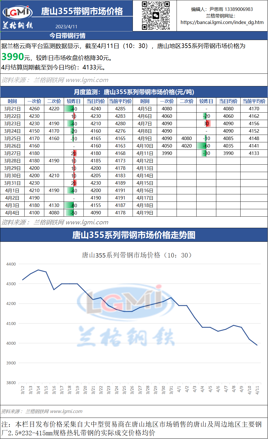 - 4月11日(10:30)唐山355系带钢市场价格2023/4/11