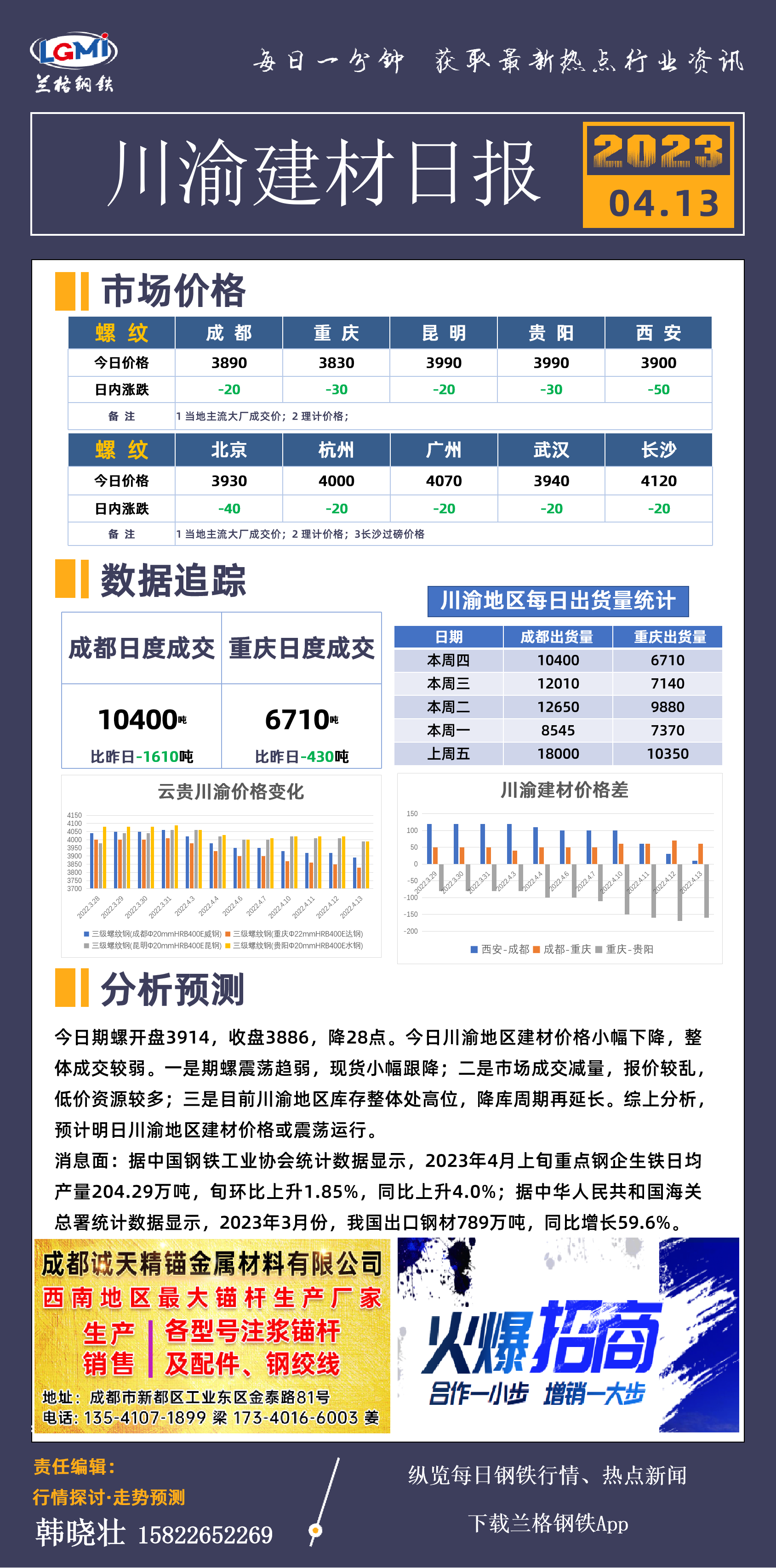 - 川渝地区建材价格小幅下降 成交较弱2023/4/13