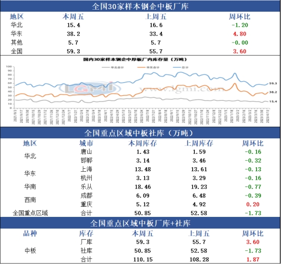 全国中厚板钢厂库存量59.3万吨,环比上周增加3.6玩吨,其中华北12家钢企中厚板厂库15.4万吨,环比上周减少1.2万吨;华东12家钢企中厚板厂库38.2万吨,环比上周增加4.8万吨。