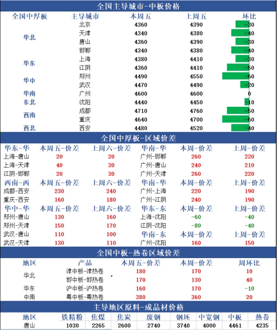 综合来看,本周国内中厚板市场价格走低,商家出货表现相对平淡。本周期货持续震荡,中厚板现货商家心态偏弱,截止发稿,重点地区邯郸报4340元、上海报4380元、乐从报4600元,环比上周降10-60元。本周行情方面,周初期货盘面持续下滑,拖拽现货面价格,中厚板现货商家心态转弱,报价下调;周中市场需求偏弱;后期期货盘面呈现弱反弹态势,对现货部分市场稍有支撑,中厚板个别区域小幅探涨。预计短期市场价格将维持盘整。