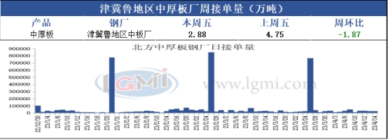 中厚板接单量今日为4.75万吨,较上周五增加1.85万吨。