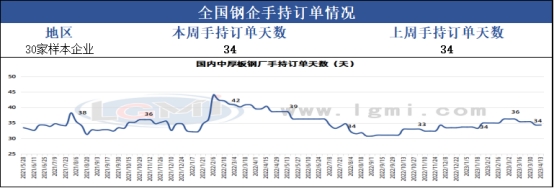 本周国内中厚板生产企业手持订单天数:一线企业手持订单天数保持在40-45天左右,二线企业基本保持在35-40天,少部分企业保持在30天左右。