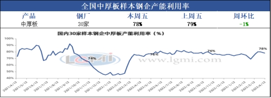 本周全国中厚板钢厂周产量141.52万吨,轧线产能利用率78%,环比上周下降1个百分点,5条轧线未满产。