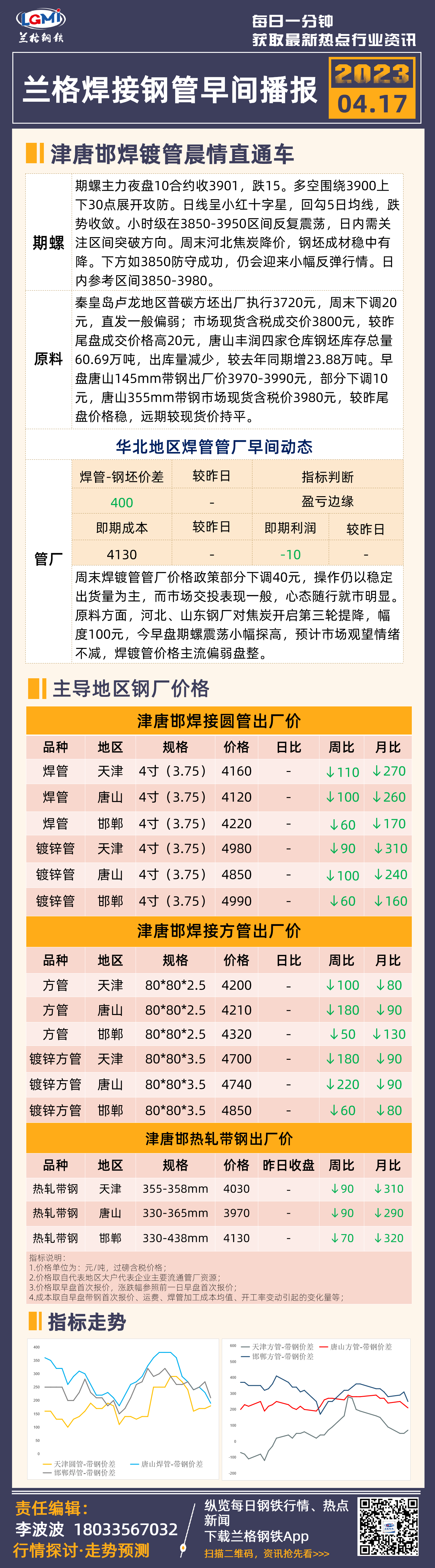 4月17日(9:20)兰格津唐邯焊接钢管早间速递
