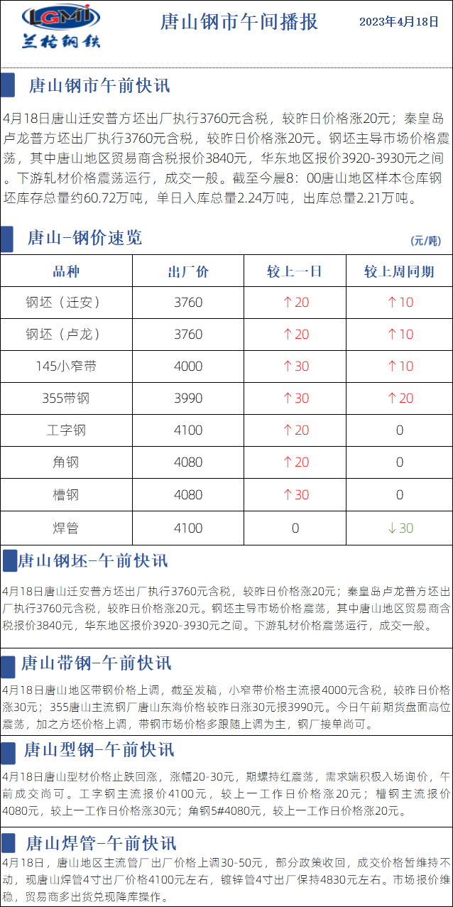 - 4月18日唐山津西钢铁带钢出厂价格涨40元2023/4/18