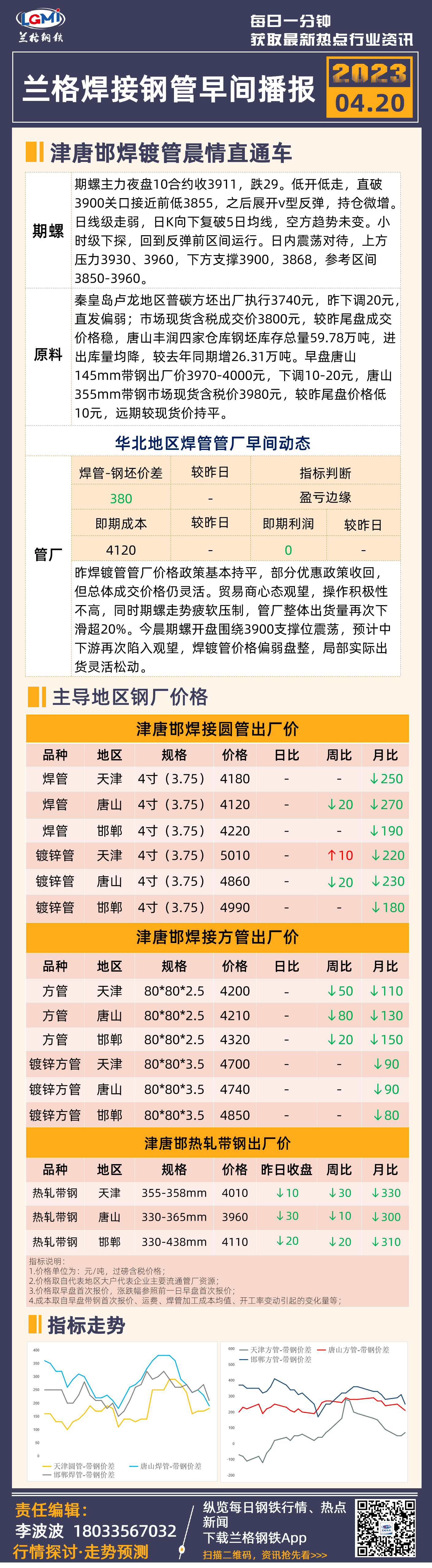 4月20日(9:20)兰格津唐邯焊接钢管早间速递