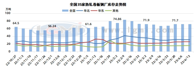 据兰格钢铁网统计,本周全国热卷钢厂库存量72.04万吨,较上周同期微增0.04万吨。其中华北20家钢企热卷厂库31.24万吨,较上周小幅增加0.24万吨;华东6家钢企厂库25.6万吨,较上周同期微降0.2万吨左右。具体解读来看,本周钢厂本周热卷产量维持增量,下游刚需释放尚可,本周钢厂热卷钢厂库存基本维持稳定。