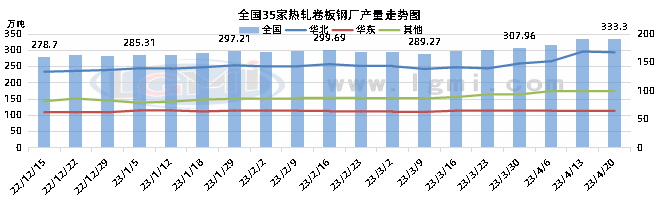 本周全国热卷钢厂周产量333.3万吨,较上周微降1.36万吨。其中华北地区下降1.36万吨到168.15万吨;华东区域热卷产量65.85万吨,较上周增加0.7万吨;其他区域热卷产量99.3万吨,较上周表现下降0.7万吨。