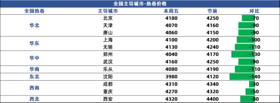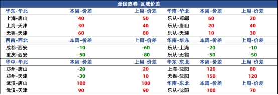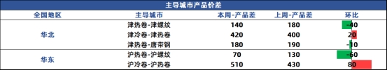 产品价差窄幅波动。天津热卷-螺纹价差收窄至140元,上海冷卷与热卷价差增加至510元。
