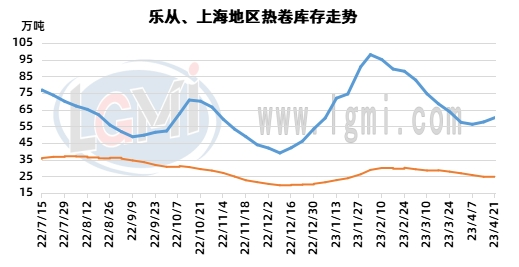 本周全国热卷社会库存总量在226.06万吨,较上周增加4.03万吨,同比下降14.46万吨。重点城市库存走势方面,上海区域热卷社会库存降库有所放缓,乐从库存继续增加。据统计,截至4月21日,乐从地区热卷库存60.18万吨,较上周增加2.6万吨;上海地区热卷库存24.17万吨,下降0.5万吨。