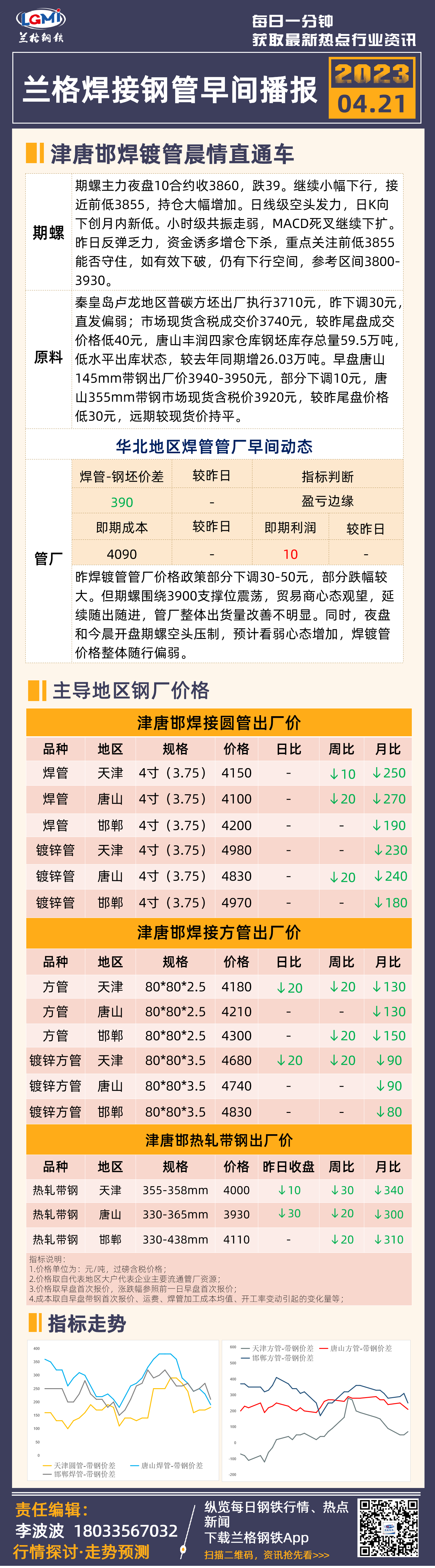 4月21日(9:20)兰格津唐邯焊接钢管早间速递