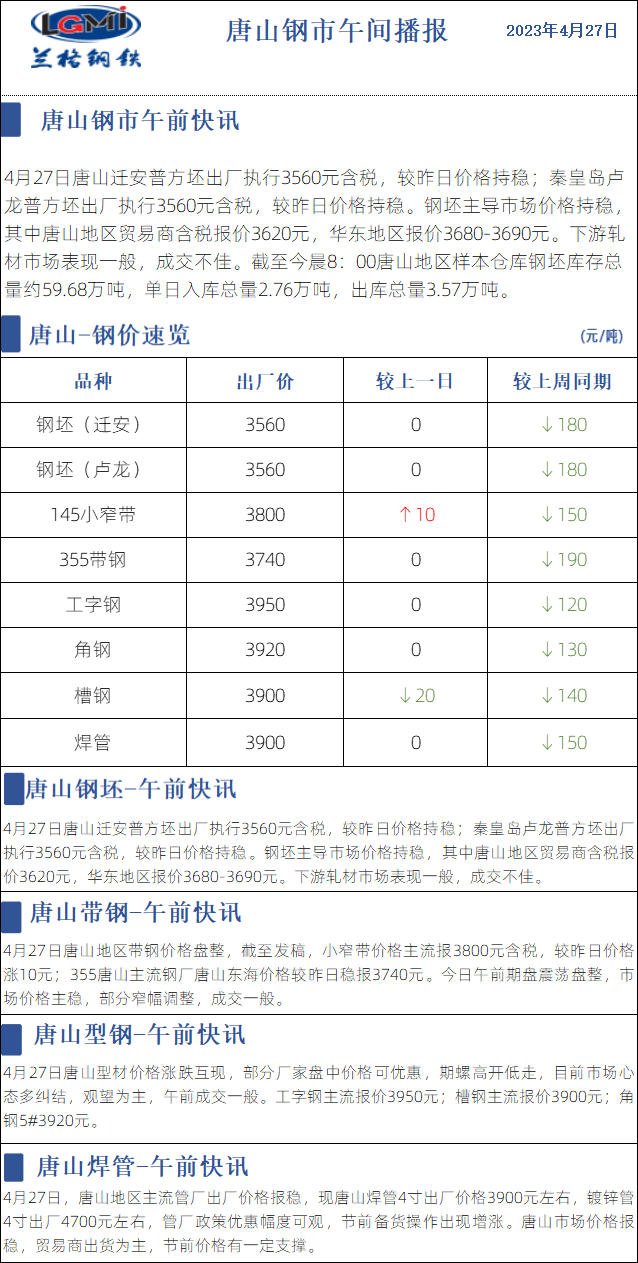 - 4月27日唐山津西钢铁带钢出厂价格稳2023/4/27