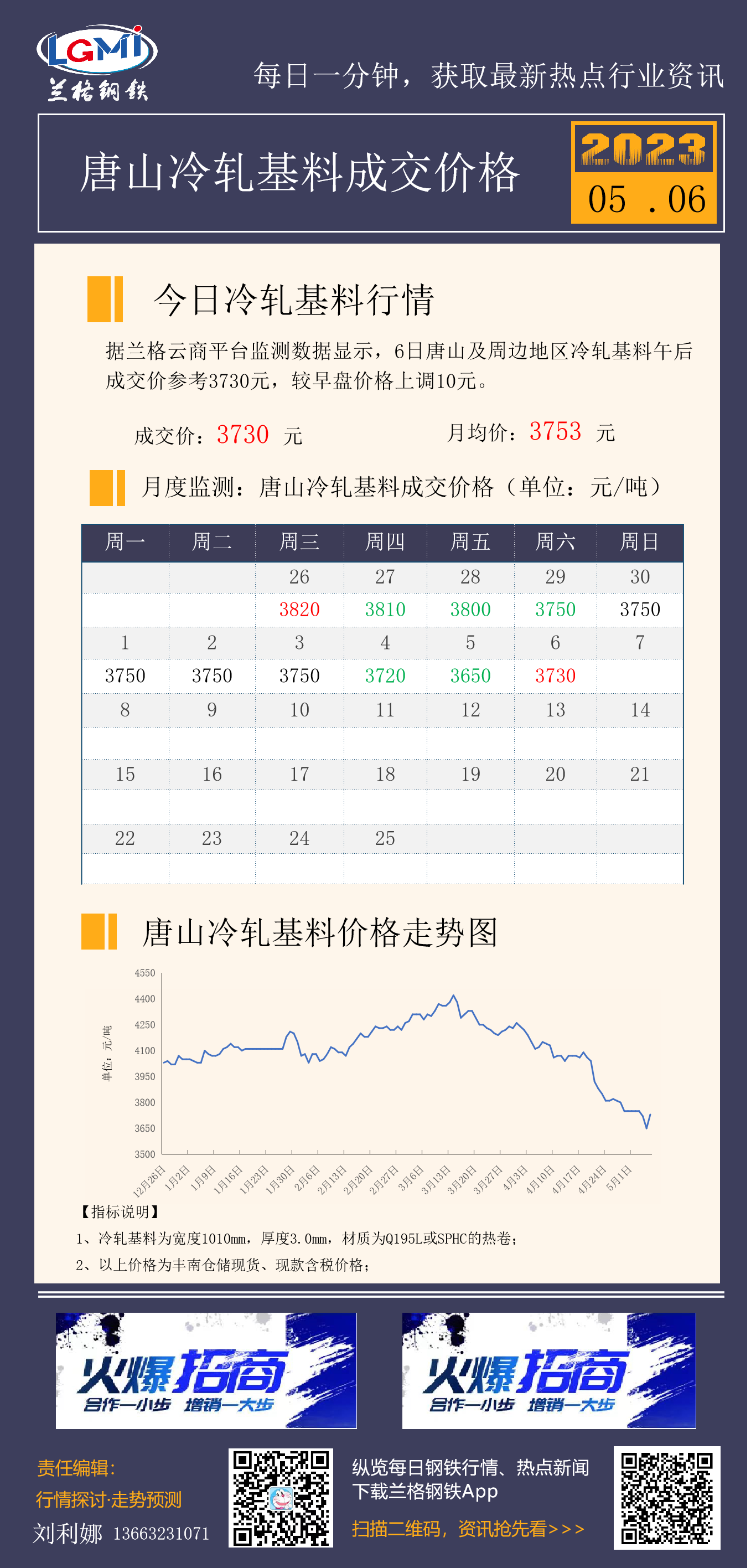 - 5月6日兰格钢铁网废钢流通基准价格指2385降82023/5/6