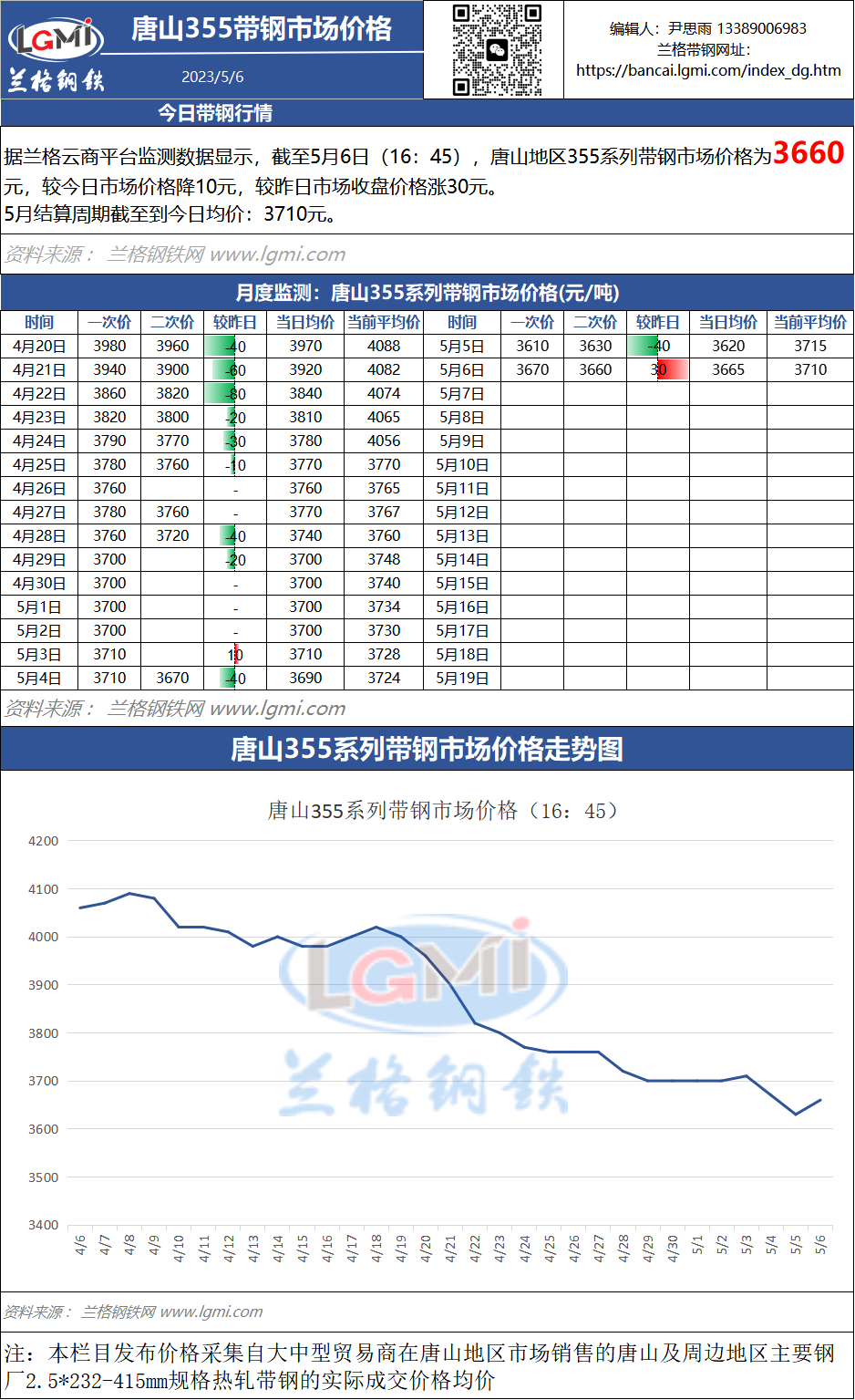 - 5月6日(16:45)唐山355系带钢市场价格2023/5/6
