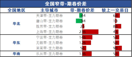全国窄带期卷价差较上一交易日拉大,具体如下: