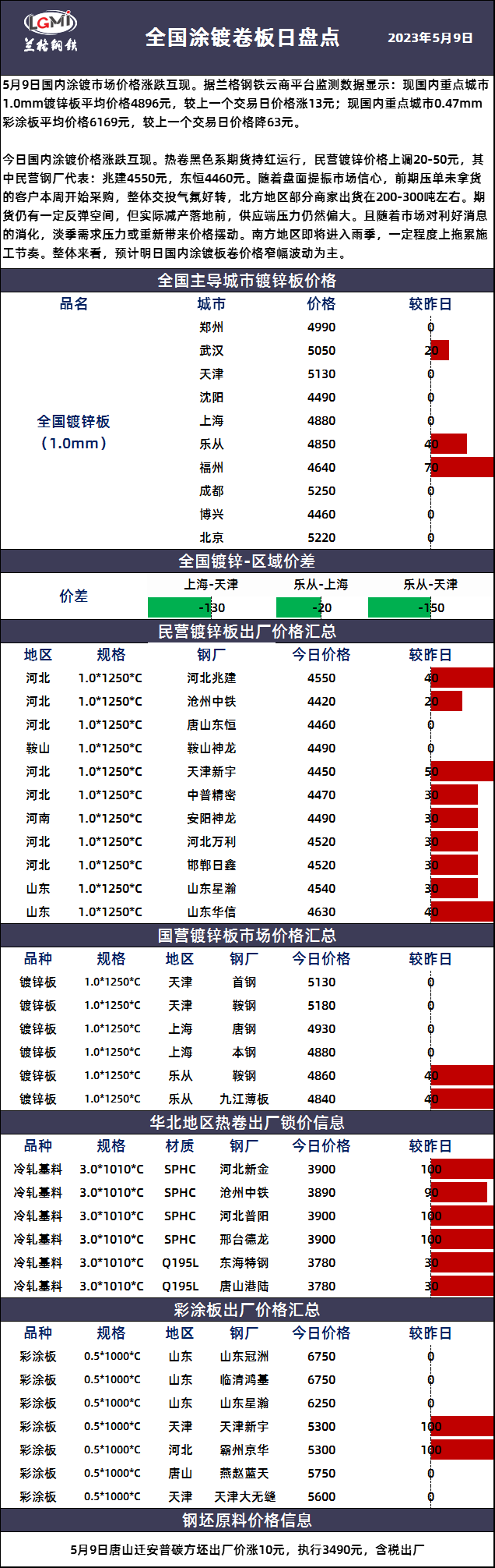 - 5月9日全国钢厂建筑钢材调价汇总2023/5/9