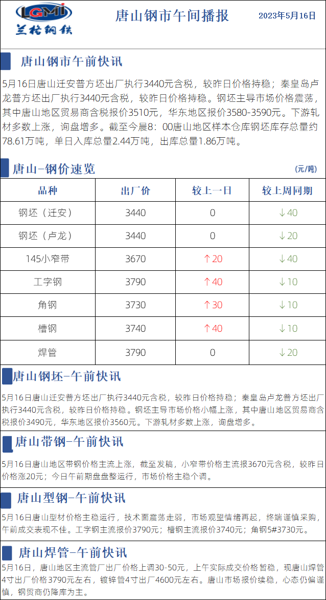 - 5月16日山西晋南钢铁建筑钢材出厂价格平稳2023/5/16