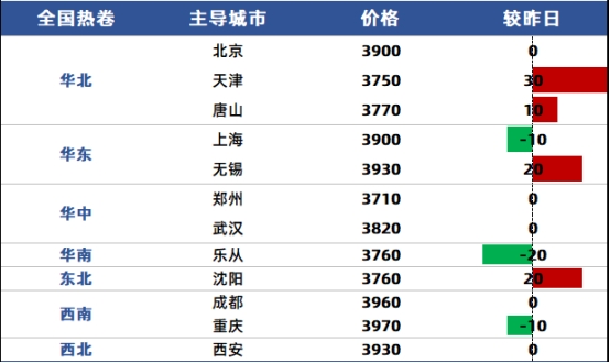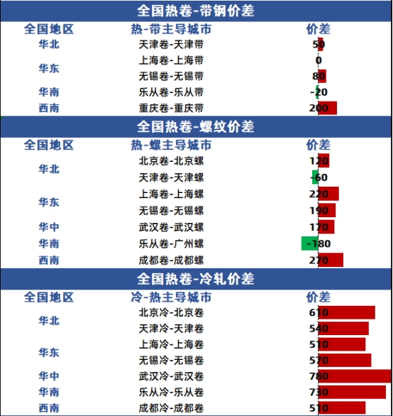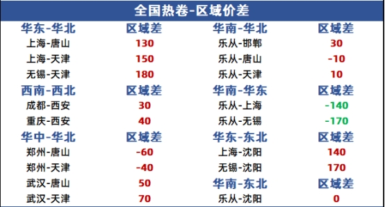 南北区域价差小幅收窄。上海-唐山价差130元,上海-天津价差150元,乐从-邯郸价差30元,乐从-唐山价差-10元。