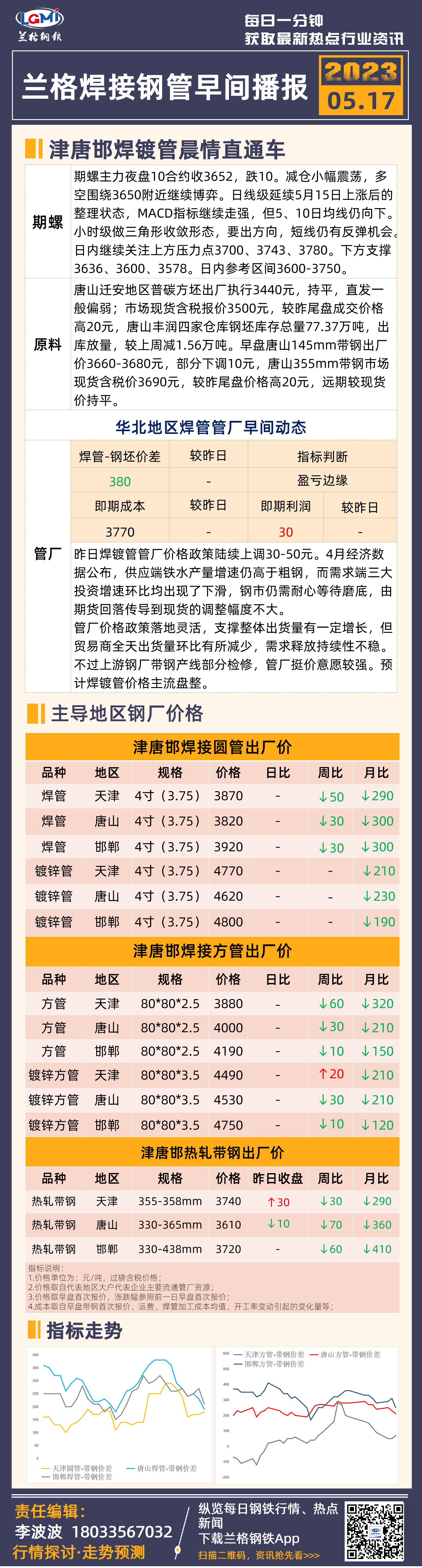 5月17日(9:20)兰格津唐邯焊管、镀锌管早间速递