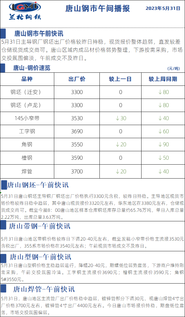 - 5月31日兰格唐山钢市午间播报2023/5/31