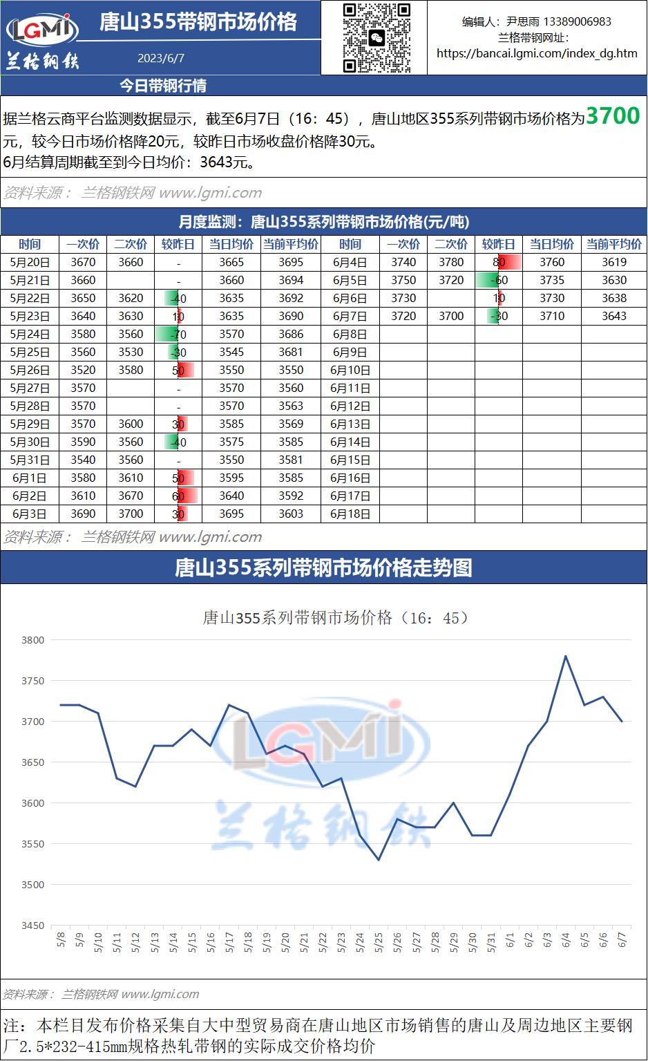 - 调价:6月7日唐山东海带钢出厂价格再降20元2023/6/7