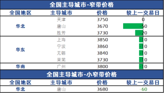 ●市场概览:据兰格钢铁网监测数据显示:今日国内带钢市场价格主流下调,截至发稿:唐山145小窄带首唐宝生报3680元,较上一交易日价格降60元;355系主流唐山东海报3670元,较上一交易日价格降50元;华东地区,无锡热轧带钢(2.5*355mm)中天报价3840元,较上一交易日价格降10元;华南地区,乐从热轧带钢2.5*(232-355mm)唐山瑞丰报价3800元,较上一交易日价格降10元。