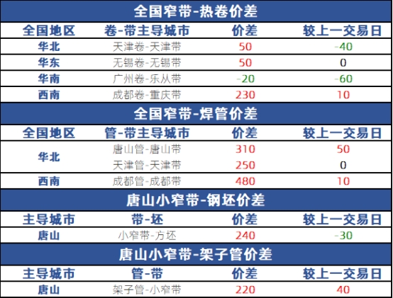 从品种价差来看,天津卷带价差50元,无锡卷带价差50元,广州-乐从卷带价差20元,成都-重庆卷带价差230元;唐山管带价差310元,天津管带价差250元,成都管带价差480元;唐山坯带价差240元,唐山架子管带价差220元。