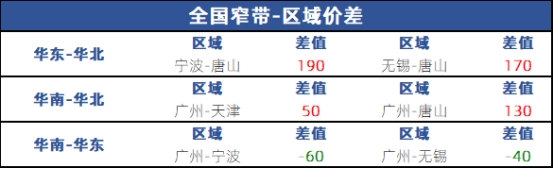 从区域价差来看,华东与华北价差170-190元;华南与华北价差50-130元;华南与华东价差40-60元。