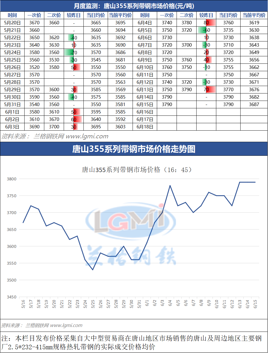 据兰格云商平台监测数据显示,截至6月15日(16:45),唐山地区355系列带钢市场价格为3790元,较今日市场价格持稳,较昨日市场收盘价格持稳。