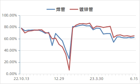 5月6日唐山市丰南区发展和改革局的“红头文件”正式打响了产量平控的“第一枪”,在统计唐山地区钢厂带钢产能利用率快速下降4.33个百分点,但随钢厂利润修复,5月中下旬产能利用率出现回升,甚至赶超4月同期,管厂为转移因协议带来的被动压力,逐步小幅提升产能水平。6月国内降息、美联储暂停加息等消息逐步将政策利好推至顶峰,不过在需求及成本的共同影响下,上游钢厂、管厂产能水平均保持在减产后的缓慢恢复阶段。