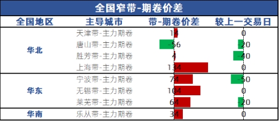 全国窄带期卷价差较上一交易日缩小,具体如下: