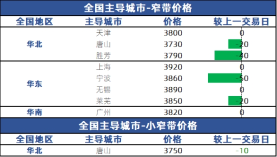 ●市场概览:据兰格钢铁网监测数据显示:今日国内带钢市场价格下调,截至发稿:唐山145小窄带首唐宝生报3750元,较上一交易日价格降10元;355系主流唐山东海报3730元,较上一交易日价格降20元;华东地区,无锡热轧带钢(2.5*355mm)中天报价3890元,较上一交易日价格持稳;华南地区,乐从热轧带钢2.5*(232-355mm)唐山瑞丰报价3820元,较上一交易日价格持稳。